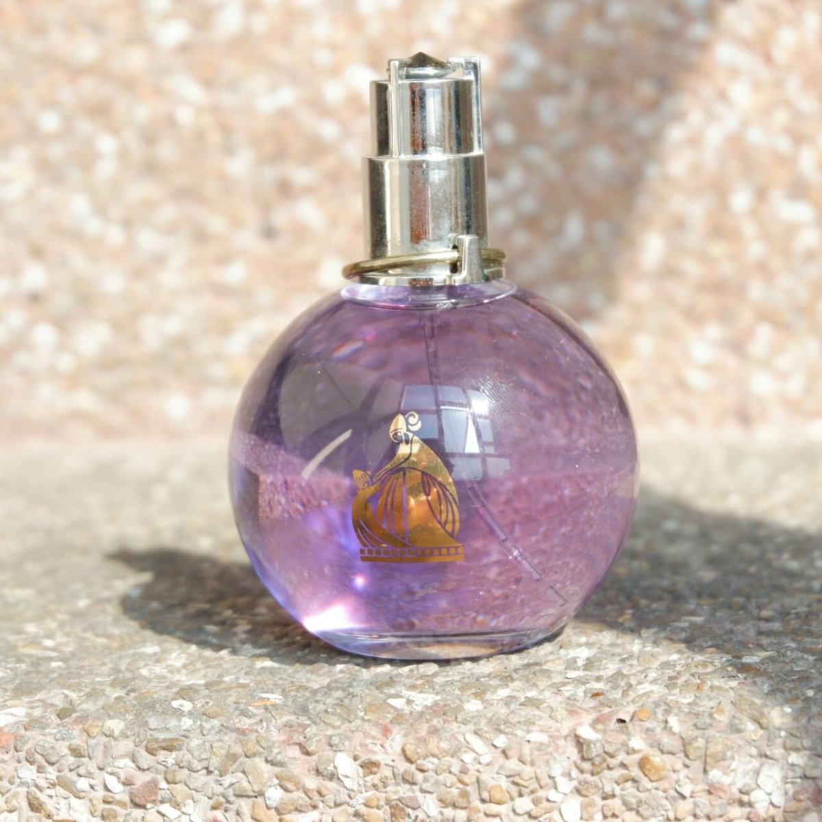 - Elegant bottle with lilac hue and golden details